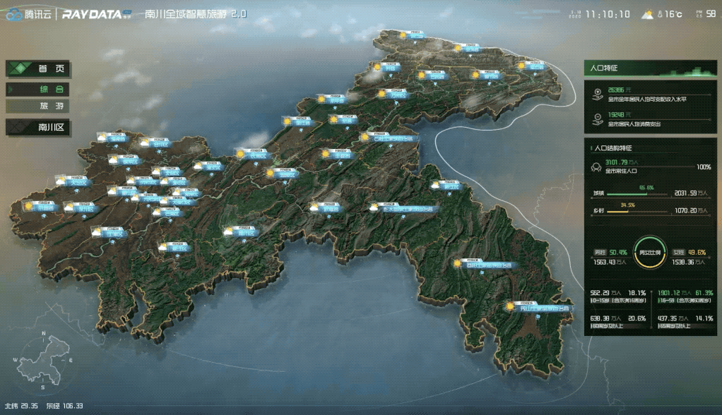 集RayData大数据可视化、腾讯位置服务、南川小程序、南川慢直播、南川文创周边、南川宣传推广活动等全方位服务为一体,为全域旅游发展提供创新化的解决方案,助力南川文旅业转型升级和数字化创新实践。